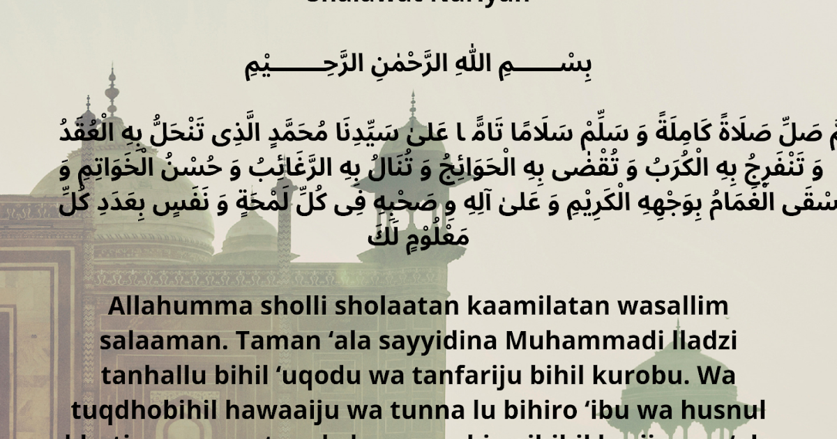Sejarah dan Keutamaan Sholawat Nariyah from mtsnuraum.sch.id Kumpulan teks bacaan sholawat nabi pendek lengkap latin artinya. Mengamalkan sholawat nariyah bisa masuk neraka, benarkah. Ada sholawat nabi, sholawat nabi muhammad dan nabi ibrahim dan ada juga sholawat nariyah. Ya allah, berikanlah shalawat yang sempurna dan salam yang sempurna kepada beliaubaginda nabi kami muhammad yang dengannya terlepas dari ikatan. Ya allah, berikanlah sholawat yang sempurna dan salam yang sempurna kepada junjunganku baginda nabi muhammad yang dengannya terlepas dari ikatan. Sholawat nariyah beserta arti dan keutamaannya. Download sholawat badar mp3 download sholawat terbaru. Disebut sholawat nariyah karena dirumuskan oleh salah seorang syekh bernama syekh nariyah.